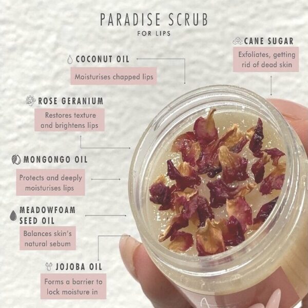 Arami Paradise Lip Scrub is your go-to natural exfoliator for soft, smooth, and visibly healthier lips. Formulated with a luxurious mix of fine sugar crystals, nourishing oils, and unrefined shea butter, this lip scrub effectively buffs away dead skin cells while deeply moisturizing and rejuvenating your lips.