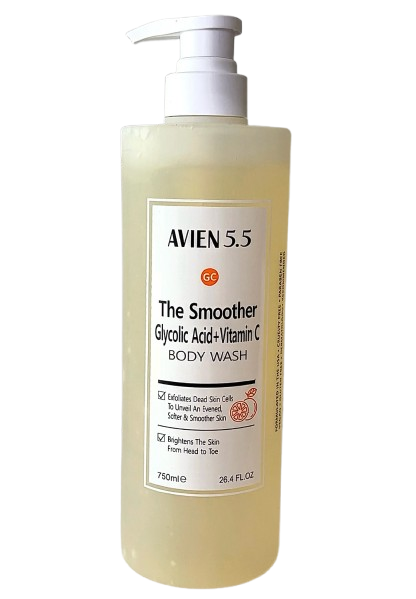 Avien 5.5 The Smoother Glycolic Acid + Vitamin Body Wash effectively exfoliates dead skin cells, promotes collagen production, evens skin tone and also brightens to leave skin glowing with a softer, supple and smoother feel.