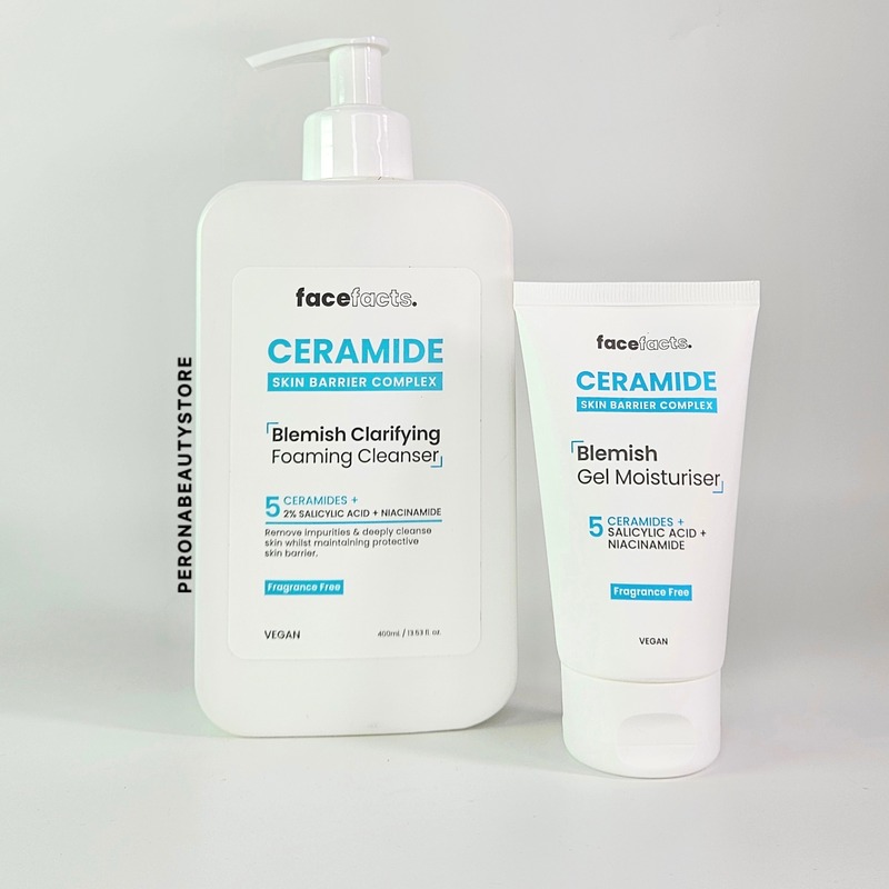 The Duo includes : FaceFacts Ceramide Blemish Gel Moisturiser 50ml & Ceramide Blemish clarifying Foaming Cleanser 400ml