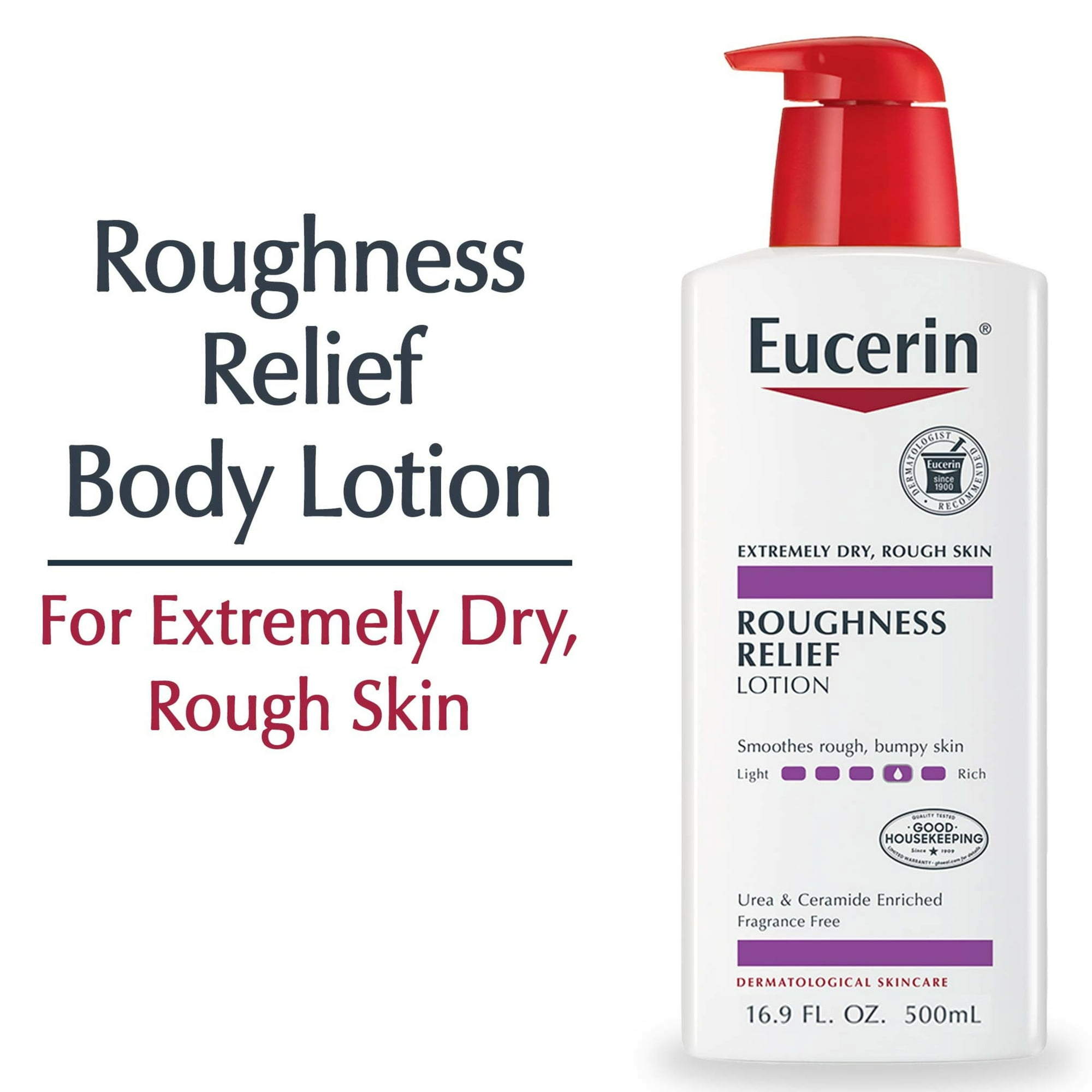 Eucerin Roughness Relief Lotion |16.9 Oz specialized formula is enriched with Urea, which is produced naturally in the skin, to improve natural exfoliation and improves the condition of dry, rough and bumpy skin. The rich formula also contains Natural Moisturizing Factors, amino acids naturally found in the skin, to hydrate and help prevent dryness from reoccurring. Roughness Relief Lotion is fragrance free, dye free, and safe to use on sensitive skin.
