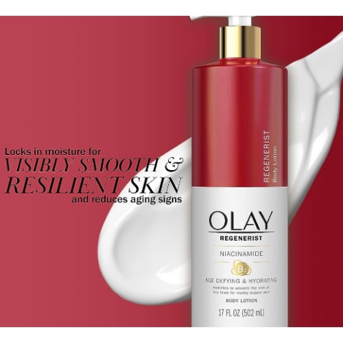 Olay Regenerist Hand and Body Lotion Pump with Niacinamide Replenish your skin with the deep moisture of Olay Age Defying Hand and Body Lotion with Niacinamide. This hydrating lotion has a nutrient-rich formula, crafted with Niacinamide and our Vitamin B3 Complex, and was created specifically to deeply nourish your skin from head to toe. Our formula hydrates to smooth the look of fine lines for visibly smooth skin. We love our Vitamin B3 Complex as it helps your skin hold on to water so it can become its own moisturizer. You’ll love your skin’s visible transformation without the greasy residue of other types of body cream. This body cream also absorbs quickly, penetrating skin up to 10 layers deep and leaving your skin with long-lasting smoothness and increased cell turnover. Use daily all over your body during your morning or evening routine. To boost the effects of Vitamin B3 Complex and moisturizing ingredients, we recommend pairing it with the entire Niacinamide Olay Skin & Body Collection.