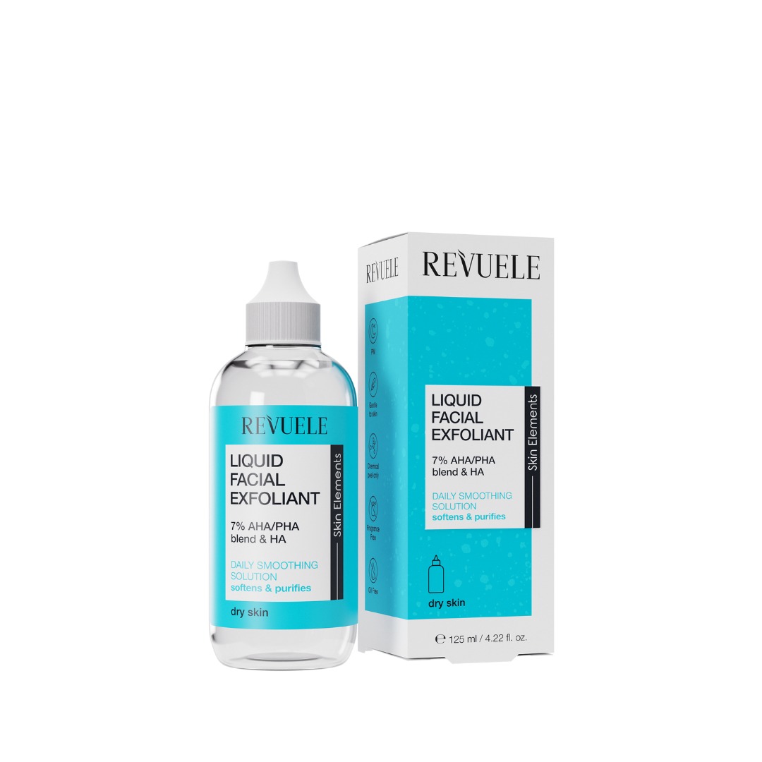 Revuele Liquid Facial Exfoliant with 7% AHA/PHA Blend + HA 125ml delicately exfoliates and renews the skin’s surface, revealing a smoother and more radiant complexion, while Hyaluronic Acid ensures hydration and skin revitalization.