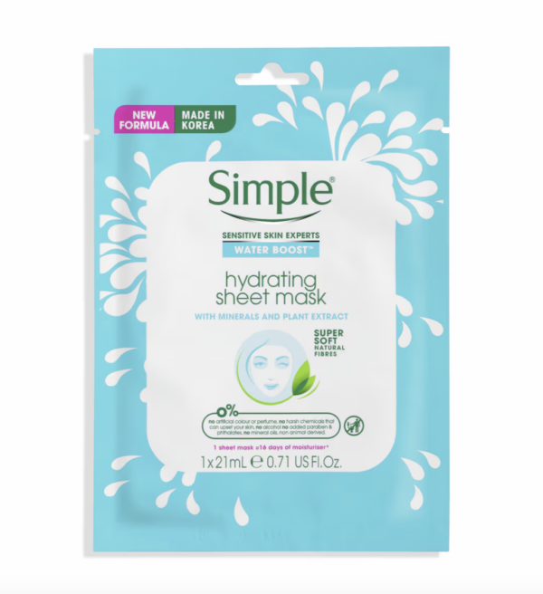 Whether you’re recovering from travel, exposure to dry air, or simply need a hydration boost, the Simple Water Boost Hydrating Sheet Mask is the perfect self-care essential to restore your skin’s natural glow and softness.
